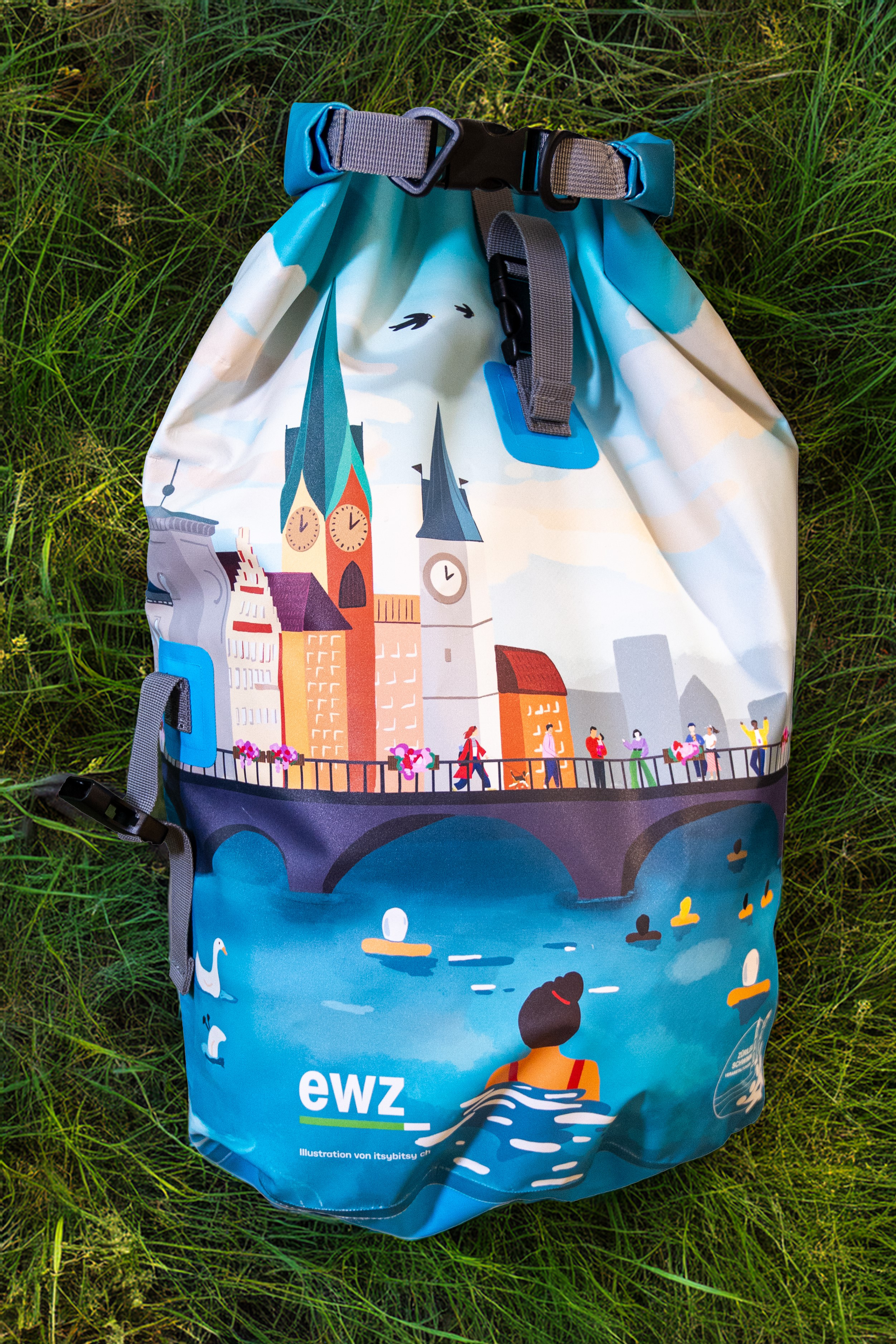 Der neuer Schwimmsack geht am Limmatschwimmen 2025 erstmals an den Start. Eine echte Innovation, denn an Land kann er dank zusätzlichen Halterungen als Rucksack verwendet werden. Perfekt fürs Wasser, aber auch für die Berge. Das Design ist eine Erweiterung vom letztjährigen Badetuch von Itsybitsy.
